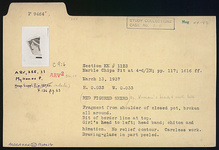 | Description: | Fragment from shoulder of closed pot, broken all around. Bit of border line at top. Girl's head to left; headband; chiton and himation. No relief contour. Careless work. Drawing-glaze in part peeled. Cf. Hesperia 93 (2024), p. 215 (noted). | |