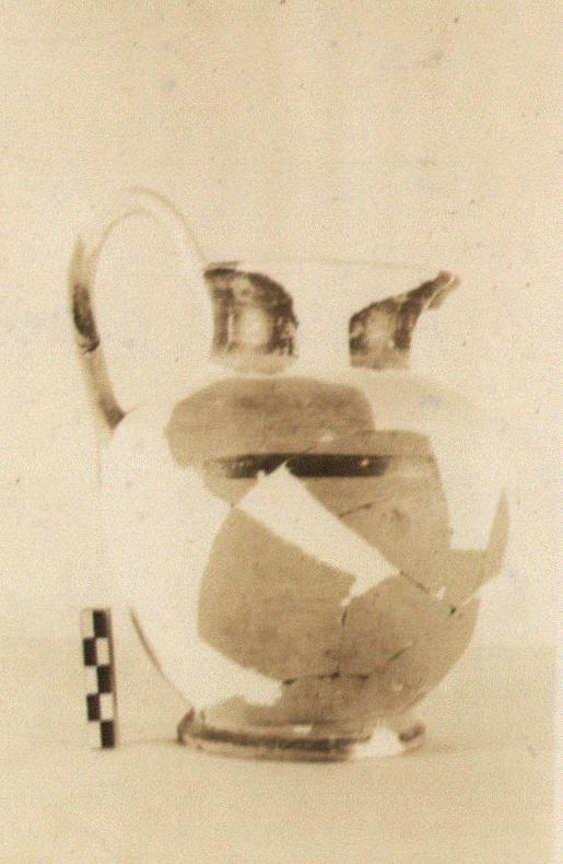 | Description: | Many fragments missing. Restored in plaster. Low ring base; squat body; round mouth; strap handle. Restored in plaster; neck and shoulder fragments do not quite join and the restored portions of the shoulder are somewhat too sharp and high. Bands of black around base ring and shoulder. Lip glazed, inside and out. Cf. Agora XII, no. 151. | |