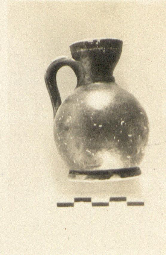 | Description: | A squat round-bodied lekythos, entirely glazed except bottom. Bulging neck, set off from shoulder by a raised ring. | |
