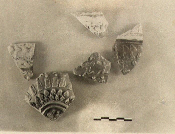 | Description: | Eight fragments, preserving much of the medallion and parts of the walls and rim. Restored in plaster. Rosette of grooved leaves on the medallion; above, two rows of such leaves, then a band of draped female figures facing, then nude winged figures flying left, then nude figures walking left, carrying packs. Above them, a broad raised band, with a narrow band above and below, and above these, below the rim, a row of trophies(?). Glaze fired red to brown; somewhat peeled. Note: Fragment f) found after photographing) | |