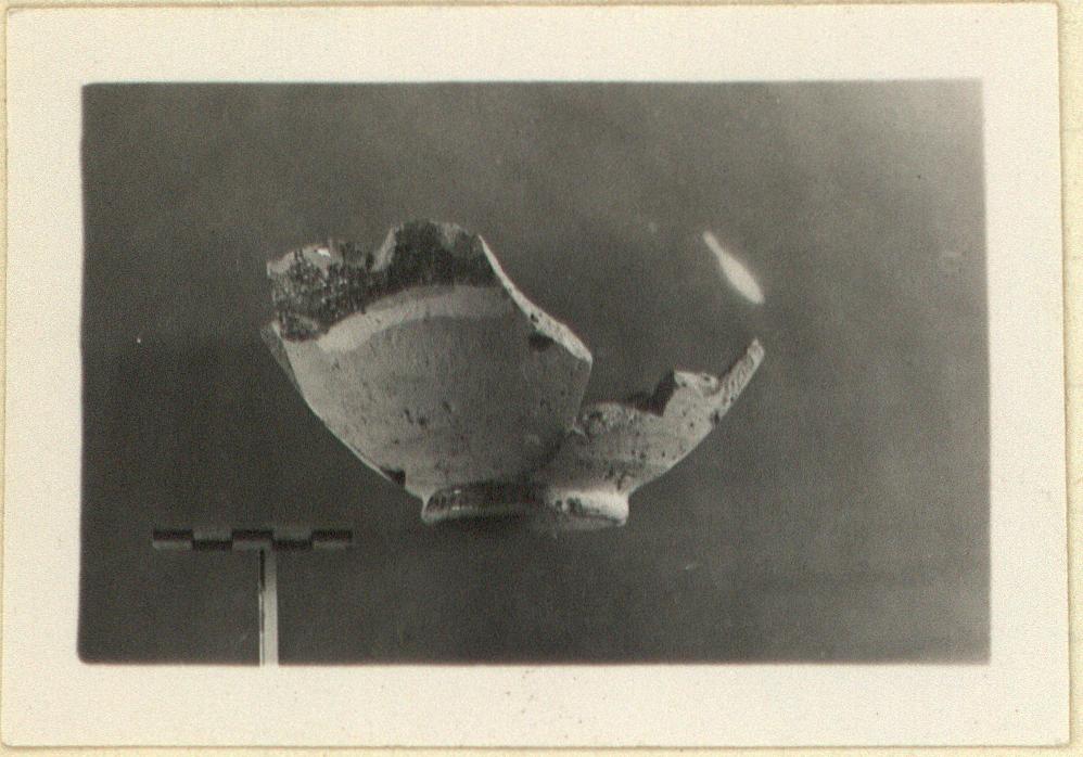 | Description: | About half preserved. Restored in plaster. A small flaring bowl covered with a mottled light brown glaze on the inside. Thumb marks of white slip around inside of rim. Buff clay. | |