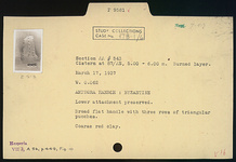 | Description: | Lower attachment preserved. Broad flat handle with three rows of triangular punches. Coarse red clay. | |