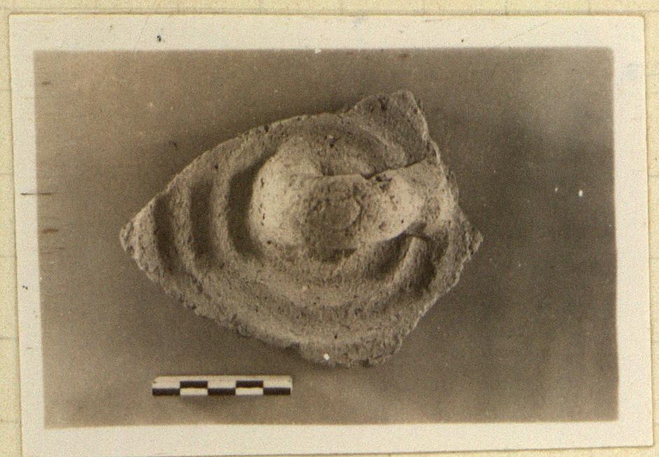 | Description: | Broken all around except for a small part of the rim. A flat lid with concentric grooves and a vertical loop handle. Coarse buff clay; traces of burning. | |