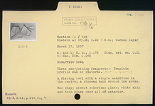 | Description: | Three non-joining fragments. Complete profile can be restored. Restored in plaster. A flaring bowl with a simple medallion in the center; a rinceau band around the sides. Red clay; almost colorless glaze; white slip and thin glaze over all of exterior. | |