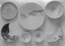 | Description: | a) Preserves complete profile. b) and c) Parts of the rim. Restored in plaster. A flat plate with inturned rim. In the center, a rinceau medallion; around the edge, a crude rinceau band surrounded by double lines. Red clay; almost colorless glaze. White slip on exterior. Cf. P 3493. | |