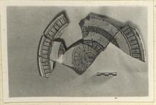 | Description: | Almost half preserved. Restored in plaster. Rather high ring foot. Three zones of ornament consisting of vertical lines, incised and sgraffito, the middle one interrupted four times(?) by a medallion of horizontal and vertical lines; a similar medallion in the center. Orange clay; yellow glaze. Creamy slip on exterior. | |