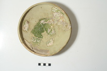 | Description: | Two small non-joining fragments from sides. Restored in plaster. Slightly inturned rim; small stem for foot or knob broken away. The inside glazed green; around the outside a scrawling conventional design. Brownish yellow glaze, much peeled. Clay gray to buff. | |