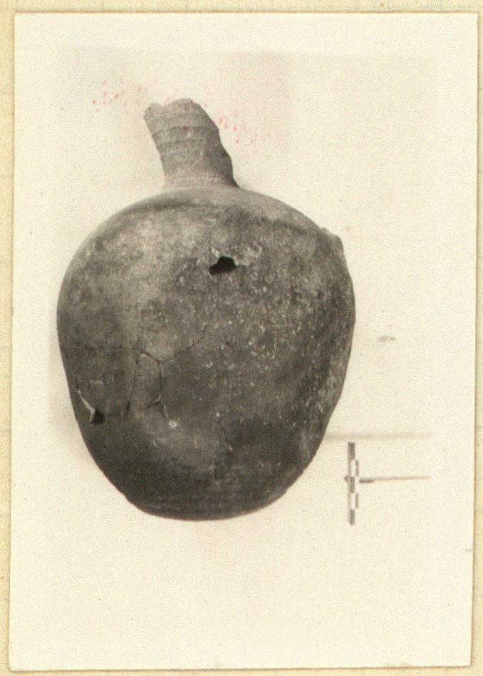 | Description: | Handle and part of lip broken away. Shallow grooves around shoulder and above base. Coarse red clay. | |