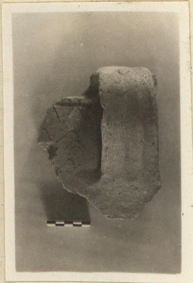 | Description: | A handle and part of the wall of a coarse jar. None of the rim preserved. Just below the upper handle attachment, a ridge, below which are three rows of incised zigzags. Coarse red clay. | |
