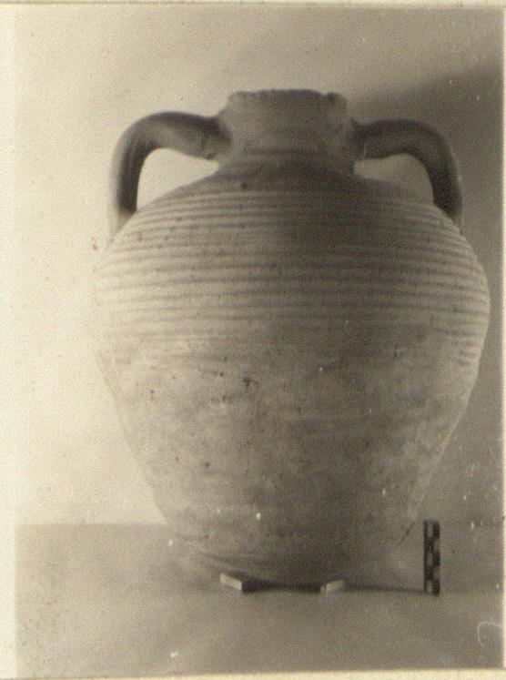 | Description: | Body shaped like an inverted pear, and rounded on the bottom; short wide neck. Ribbing on upper body and bottom. Coarseware. Light slip on body. Neck and handles added afterward of pink clay, unslipped. Early Byzantine. | |