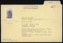 | Description: | Intact save small hole in side. Broad trefoil mouth; flat bottom. Light horizontal ribbing on body. Unglazed. Another similar, found right with this, uncatalogued. | |