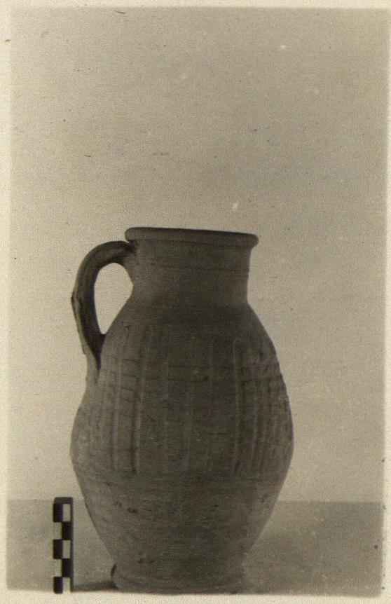 | Description: | Intact. Ring foot; round mouth; single vertical handle, roughly made, and attached. Light horizontal ribbing on body. On upper half of body, gouging, vertical to diagonal. Unglazed. Eight others, whole or nearly so, found with this, not catalogued. Slightly varying shapes and patterns of gouging. | |