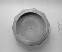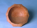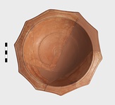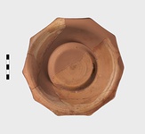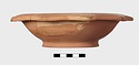 Description:   Mended from several pieces. Rather more than half preserved. Open bowl with low ring foot; rim round at inner edge, polygonal at outer. At center of floor, a swastika in a square with a circle round about.
