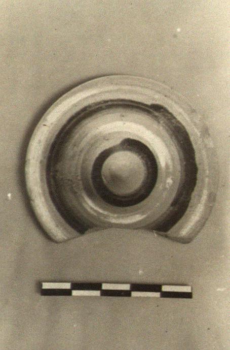 | Description: | Chip missing. Small, slightly convex lid with high central knob. Decorated with bands of white and black paint. Gritty pinkish-buff clay. | |