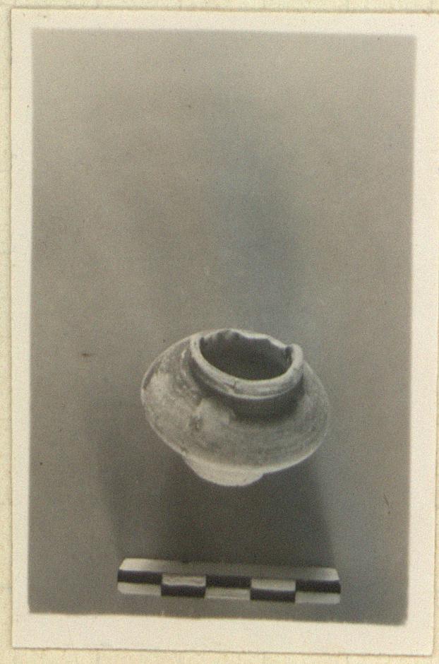 | Description: | Part of rim missing. Angular sides, vertical rim, rough bottom. Dull brownish glaze over upper part. | |