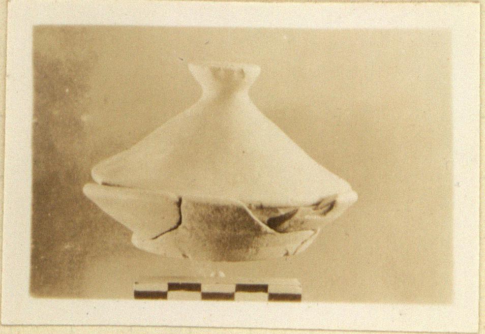 | Description: | Dish fragmentary; broad flat bottom; flaring wall lightly grooved inside for the lid. Lid intact; high conical, with central knob. Pinkish buff clay, unglazed. | |