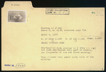 | Description: | One-handled dish similar to P 9724 (ΛΛ 682) but with out-turned rim; part of handle, and fragments of rim and floor missing. High conical lid; small knob; bits of rim missing. ADDENDA P 9724: Shallow open flat-bottomed dish with small vertical ribbon handle, lightly grooved inside for lid. Flat lid with a central knob left rough on top. | |
