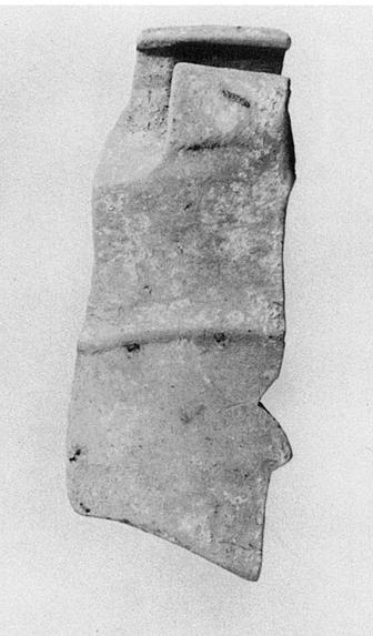 | Description: | Fragment of a large deep steep-walled bowl, with high angular concave rim set at an angle to body and finished with a small projecting rim, triangular in section. Broad vertical band handle, from junction of wall and rim, to middle of rim, not rising to lip. Moulded ring half way down wall as preserved. Light gray clay. | |