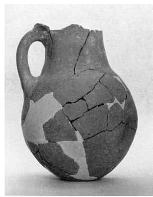 | Description: | Lip largely broken away; fragments from body missing; restored in plaster. Round-bodied one-handled pitcher; small bottom irregularly flattened; wide neck, slightly flaring plain lip. Handle, round in section, from just below rim to shoulder. Handmade. Coarse micaceous clay, buff at surface, gray at core; buff slip. ADDENDA Conservation vol. I-3. | |