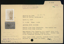 | Description: | Mended from many fragments; one handle and pieces from body missing. Egg-shaped body tapering to small ring foot; neck narrows slightly towards top; rolled rim. A few irregular grooves on shoulder. Dipinto on shoulder in black: <graphic> Clay light brown outside, reddish-brown inside. | |