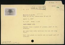 Description:   Mended from a number of pieces; part of rim missing. An open bowl with vertical rim and low ring foot.