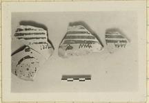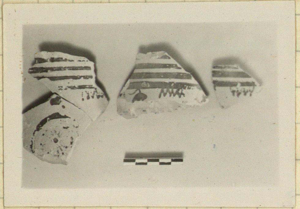 | Description: | Three fragments, probably from the lower part of a krater on a high stand. Bordered at the top with four (or more) horizontal glaze bands. Below, procession of warriors to right, with spears and shield. Zigzag in field between their heads. Pale pinkish buff clay; dull black glaze, much peeled. | |
