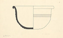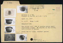 | Description: | Rim rolled out. Row of punches above small imbricated leaves. No rosette on the bottom, but a circle of leaves. Glaze red to black; somewhat peeled. | |