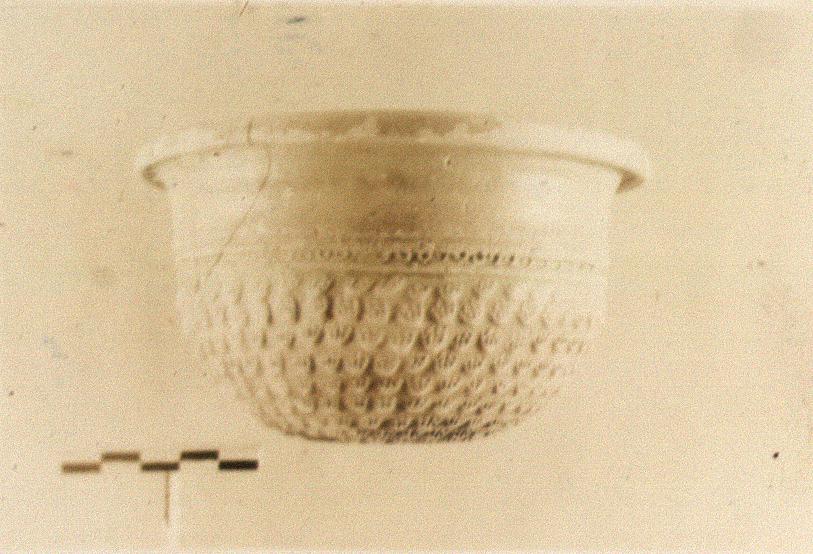 | Description: | Rim rolled out. Row of punches above small imbricated leaves. No rosette on the bottom, but a circle of leaves. Glaze red to black; somewhat peeled. | |