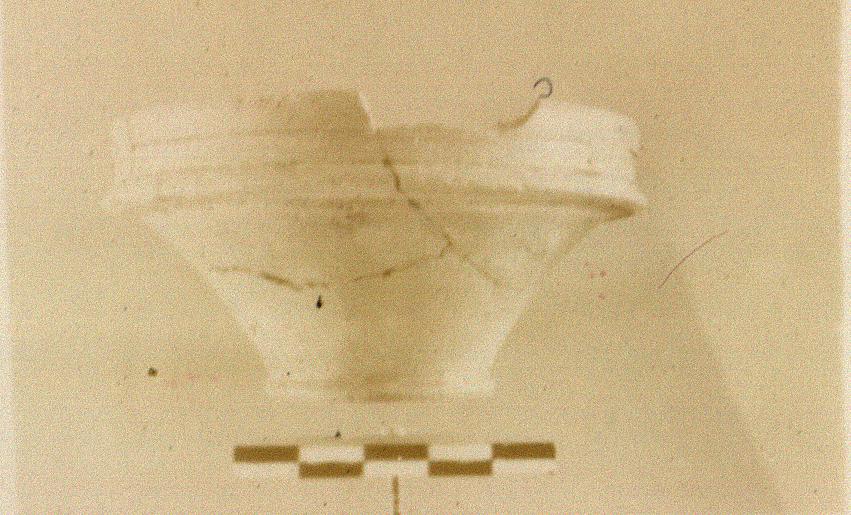 | Description: | Sigillata bowl with slightly concave sides sloping out sharply from narrow base to carinated rim. Nearly half the rim missing. Restored in plaster. Red clay with red glaze shading to black in spots, thicker inside than out. Others similar in box. | |