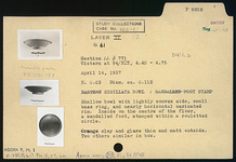 | Description: | Shallow Sigillata bowl with slightly convex side, small base ring, and nearly horizontal carinated rim. Inside on the center of the floor, a sandalled foot, stamped within a roulette circle. Orange clay and glaze, thin and matte outside. Two others similar in box. Restored in plaster. | |
