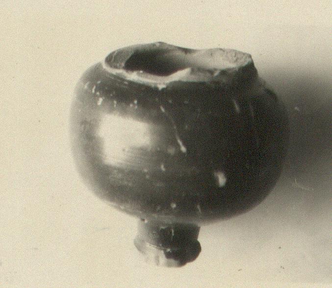 | Description: | Originally identified as a vase: Mouth broken away. Small globular vase; high stem finished smooth; no base; the stem is now pierced through from top to bottom; may have been attached to a base. Fine pinkish-buff clay. Dull black glaze. ADDENDA Subsequently identified as a knob of an amphora lid. Cf. JHS 31 (1911), p. 276, fig. 1, and p. 277, I (Berlin Painter's name piece, Berlin 2160, has a lid which is black, with pomegranate-shaped knob). | |