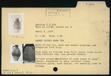 | Description: | Much of the lip, neck and handle, and fragments from body, missing. Restored in plaster. Flaring ring foot; high body; plain round mouth with vertical rim; one grooved handle. On body, gouged decoration of pine trees or palm leaves, separated by wavy vertical lines. Purplish glaze, much peeled, not reaching down to bottom. | |
