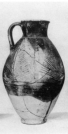 | Description: | Much of the lip, neck and handle, and fragments from body, missing. Restored in plaster. Flaring ring foot; high body; plain round mouth with vertical rim; one grooved handle. On body, gouged decoration of pine trees or palm leaves, separated by wavy vertical lines. Purplish glaze, much peeled, not reaching down to bottom. | |