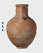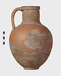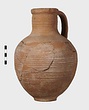 | Description: | Mended from many pieces; handle and fragments of body missing. Round mouth; thickened lip. Ribbing on neck and body. Rather coarse brown clay, fired dark at core like Byzantine. Thin fabric. Unglazed. | |