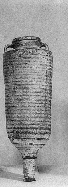 | Description: | Intact save minor fractures. Low neck; sharp shoulder; two tiny handles, from neck to shoulder; body nearly cylindrical, ribbed; pointed bottom. Coarse red clay. Coating of rather thick dull white on exterior, somewhat worn. ADDENDA Long, heavy, pointed bottom found in container 59. | |