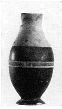 | Description: | Handle and part of lip missing. Flaring foot, unglazed beneath. Neck and shoulder unglazed. Body black glazed with wide purple stripe around middle. Fine pinkish-buff clay. Dull black glaze. Cf. P 984. | |