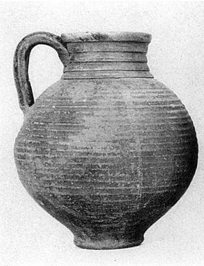| Description: | Fragment of lip missing; otherwise intact. Ring foot; round mouth; grooved handle. Ribbing on neck and body except toward bottom. Pinkish clay. Orange slip. Stuck to bottom inside, a coin. ADDENDA Coin extracted (Oct. 1951) and inventoried as coin no. 32, 7 April 1937 (= Φ-234). | |