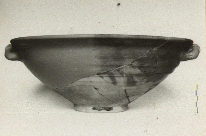 | Description: | No rim preserved. Base ring and part of flaring sides preserved. In sunken circle on floor, stamped squares filled with dots. Red-brown clay. Red glaze inside and partially on outside. ADDENDA P 11732 joins. Now restored in plaster. | |
