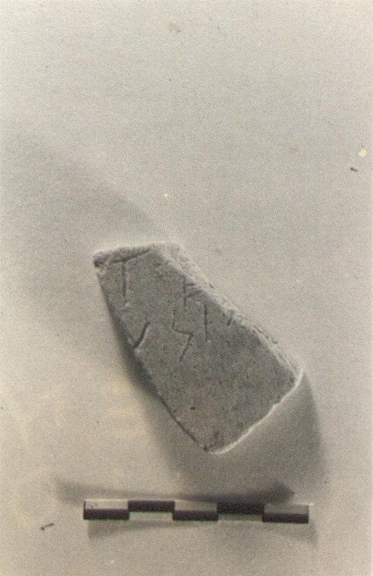 | Description: | From the wall of a plain pot, broken all around. Yellow clay. Writing on outside: <graphic> | |