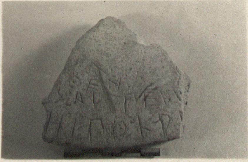 | Description: | From the wall of a closed plain pot, broken all around. Pinkish clay; light buff slip outside. Writing on outside: <graphic> | |