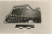 | Description: | Rim fragment from a small krater, black glazed on inside and rim only. Writing on inside: <graphic> | |