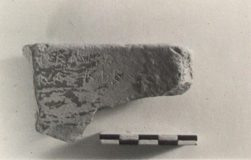 | Description: | Rim fragment from a large krater glazed red-brown on inside only. Glaze much peeled. Writing on inside: <graphic> | |