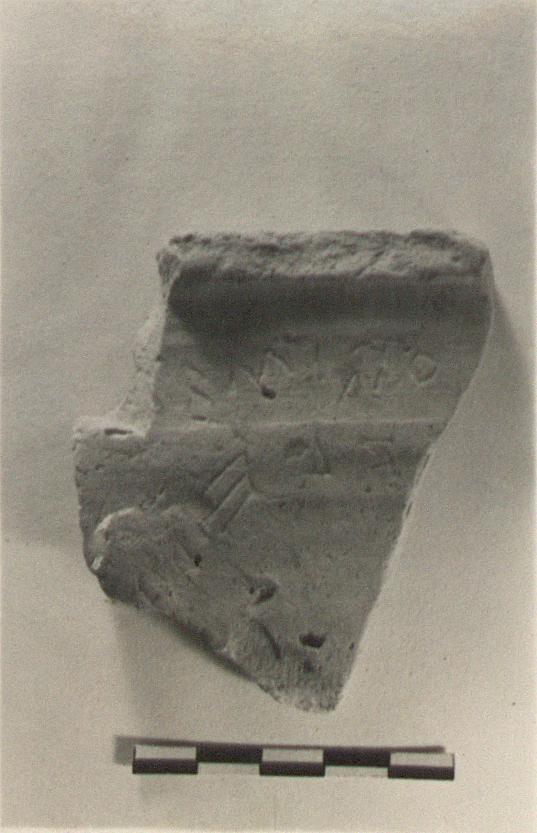 | Description: | Wall fragment from a large krater, glazed on inside only. Buff clay and slip; dull black glaze, worn. Writing on outside: <graphic> | |