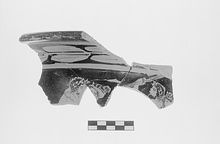 Description:   Rim and wall fragment; laurel wreath on rim, left.