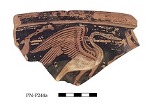| Description: | Two rim fragments from a 'double decker' krater, shape as Louvre, Pottier, Album, III, G 529,530 Battle of Pygmies and Cranes: on a) a crane, right, between two pygmies the one at the left with a club right raised hand and other at the right, object between him and the crane is probably his dropped club (?); on b) a crane, right, grasping with his beak the outstretched, drapery covered arm of a pygmy. No relief contour; white, with yellow details for parts of the cranes; glaze inside reddish brown; outside grey to black, poor, chipped. | |
