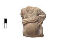 | Description: | Missing: head, right arm below shoulders, left hand, the figure below the left dome. The figure is hollow but without a vent. and fully modeled behind. Only the upper part of the figure was modeled. A male figure with padded pot belly wearing chiton and himation. Clay: Fine, buff, covered with white paint, and retaining traces of overlying re around the neck and broken arm. | |