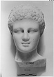 A youthful male portrait (?) head on a herm or rectangular shaft, part of the right side of which is preserved and a bit at the back. The short hair is held in place by a fillet, which is knotted at the back. The features are classic, but the mouth unusually small and the eyes somewhat deep-set.