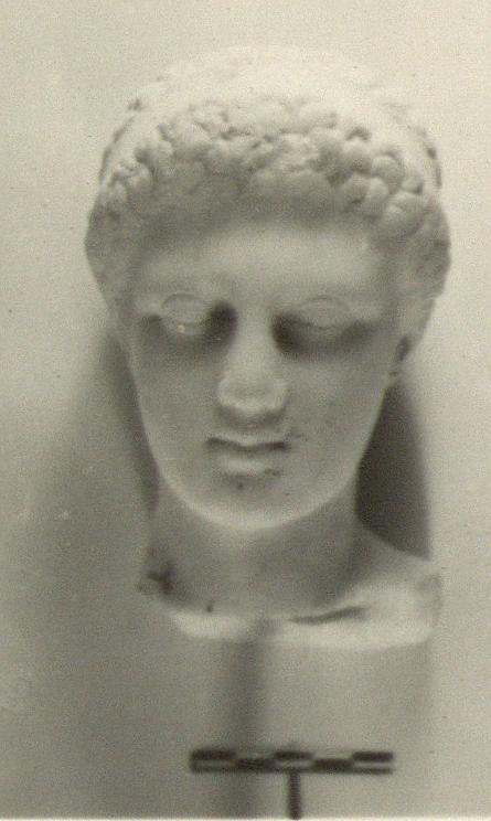 | Description: | Intact except for very minor chips on hair. Broken off at bottom of neck. A youthful male portrait (?) head on a herm or rectangular shaft, part of the right side of which is preserved and a bit at the back. The short hair is held in place by a fillet, which is knotted at the back. The features are classic, but the mouth unusually small and the eyes somewhat deep-set. The workmanship is capable, but there is little or no modeling. Very smoothly finished surface almost polished. Pentelic marble. Drilled for setting on base September 1959. Missing since 20 August 1960, apparently stolen, along with the substantial base on which it was set, on the preceding evening. The base was later found. | |