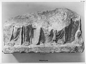 At foot of columnar object, on the ground, three or more small rectangular lumps (stones?). At extreme right, partly obscuring the drapery of the seated figure, is what resembles the coil of a large snake.