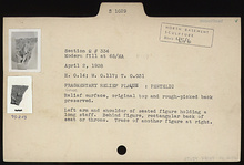 Left arm and shoulder of seated figure holding a long staff. Behind figure, rectangular back of seat or throne. Trace of another figure at right.